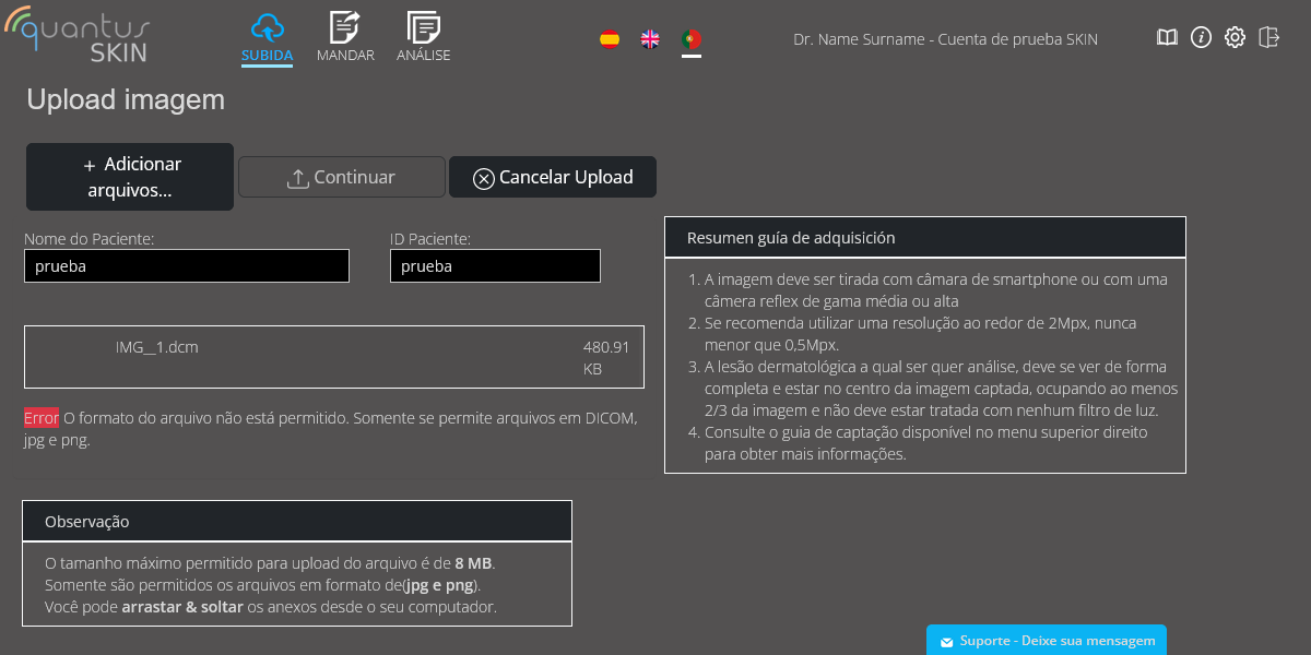 Se o upload falhou e você verificou que a imagem está no formato correto, tente fazer o upload novamente e se o problema persistir, entre em contato conosco por e-mail support@quantusos.org